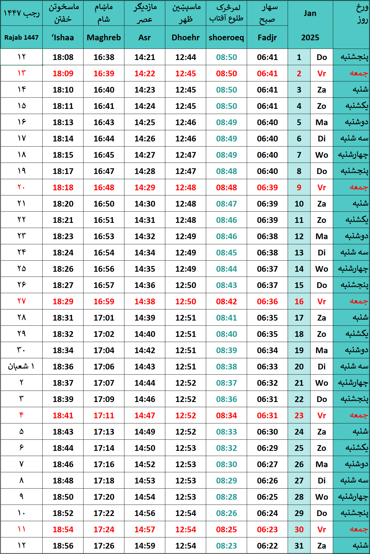 Gebedstijden januari 2026